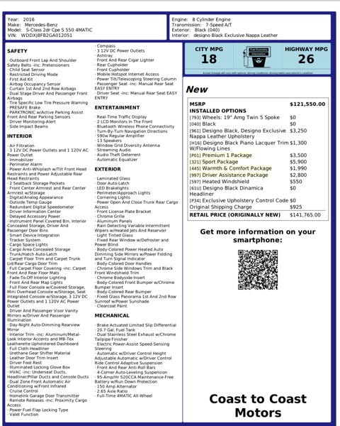 Experience luxury and performance in this stunning 2016 S550 Coupe. This vehicle is fully loaded with every premium feature Mercedes-Benz offered, from advanced driver assistance systems to a panoramic sunroof and a high-end Burmester sound system. It’s equipped with brand-new tires on all four corners, ensuring a smooth and confident ride.
